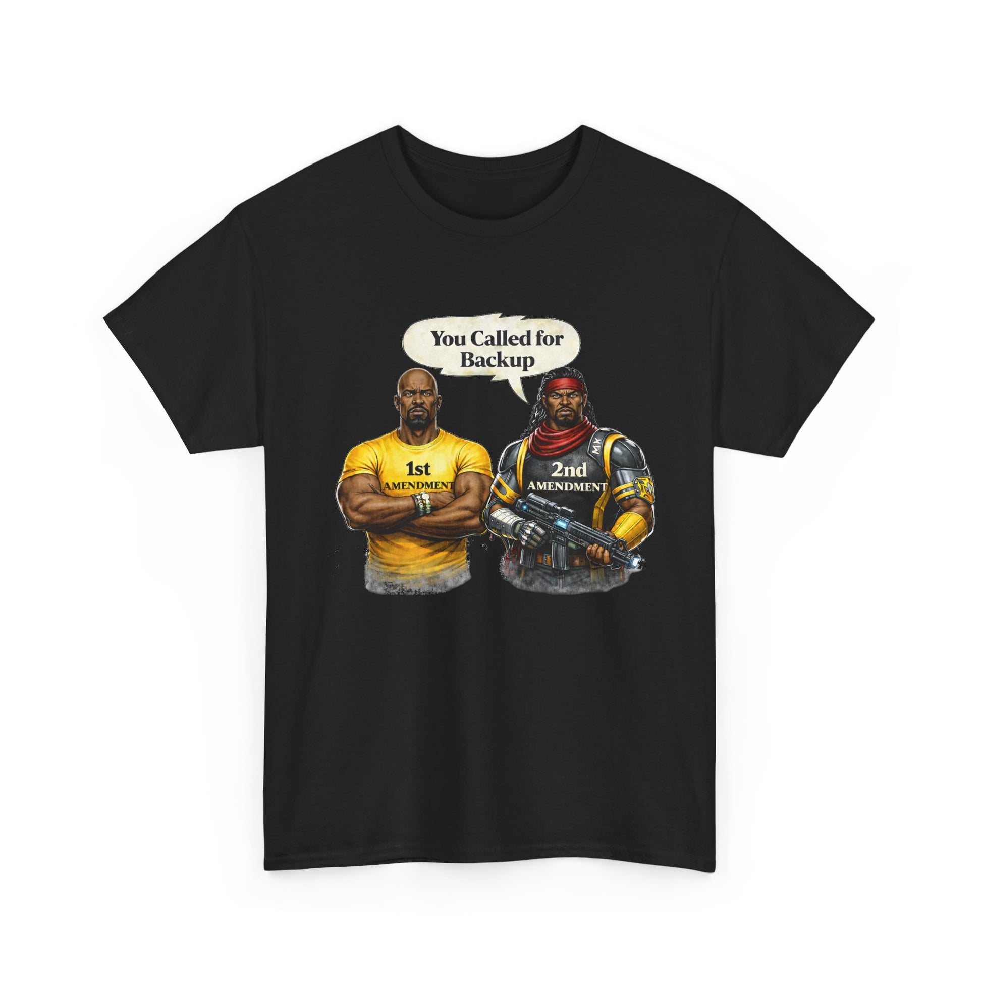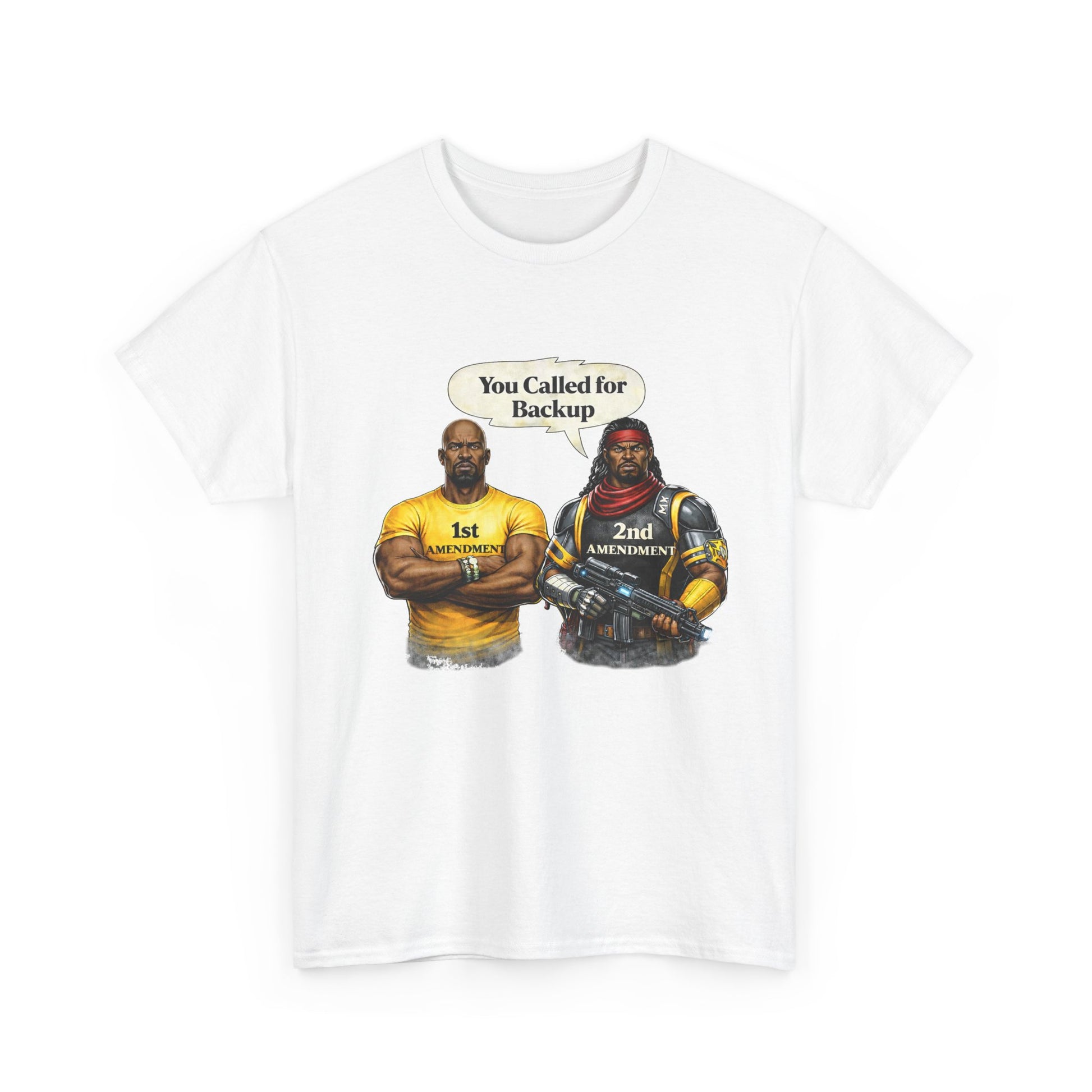 This classic crew-neck tee brings a bold, tongue-in-cheek attitude to everyday wear. On a clean white canvas, two strong, illustrated figures stand side-by-side under the caption “You Called for Backup,” creating a confident, slightly defiant vibe that reads like a statement among friends. The relaxed fit and midweight cotton drape naturally — wear it layered under a jacket or alone on warm days. It’s built to last: reinforced shoulder tape, a ribbed collar that holds its shape, and a tear-away label for scratch-free comfort. The printed artwork uses crisp, detailed techniques so the image stays vivid through regular wear. For people who like their wardrobe to speak plainly and with humor, this tee slides easily into casual weekend looks and gatherings where conversation (and opinions) run free.